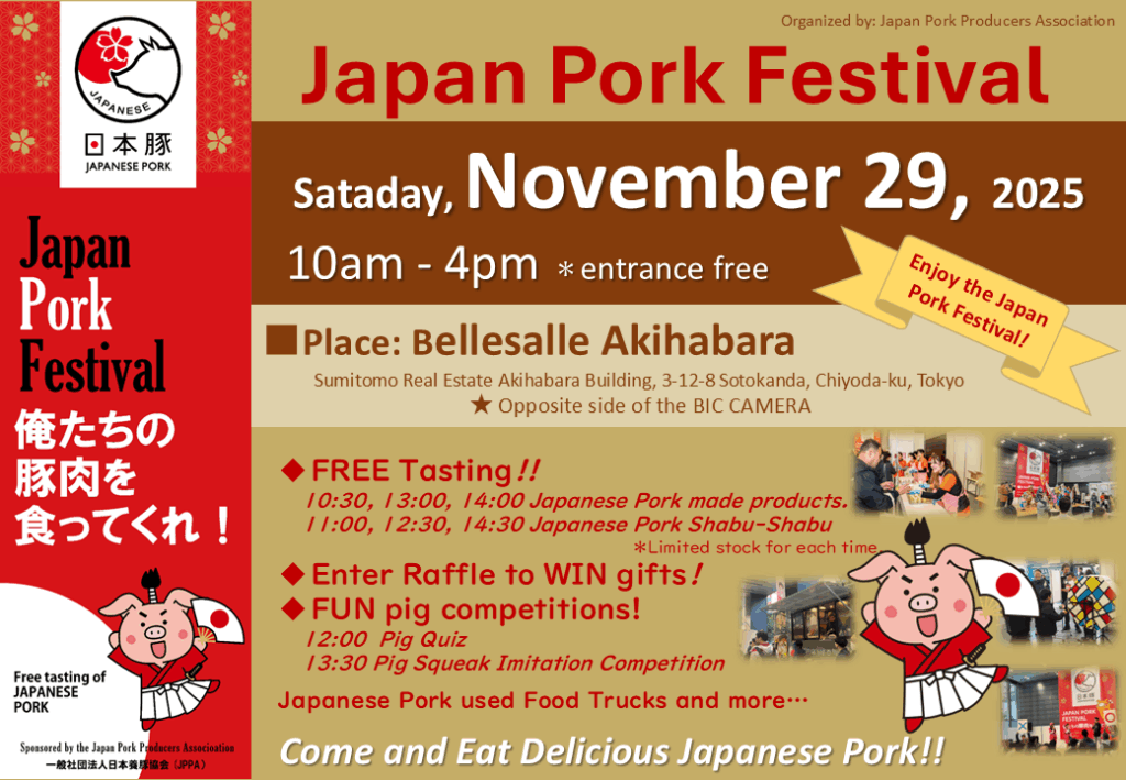 Japan Pork Festival 俺たちの豚肉を食ってくれ!2025開催のご案内 2025年10月7日 最終更新日時 : 2025年10月30日 舞子高野 20251030版 20251030版 ※詳細は随時更新予定です ※参加を希望する会員・賛助会員の皆様には別途ご案内を用意しておりますので、JPPA事務局までご連絡ください。 【問い合わせ先】 JPPA事務局TEL:03-3370-5473 担当:高野まで